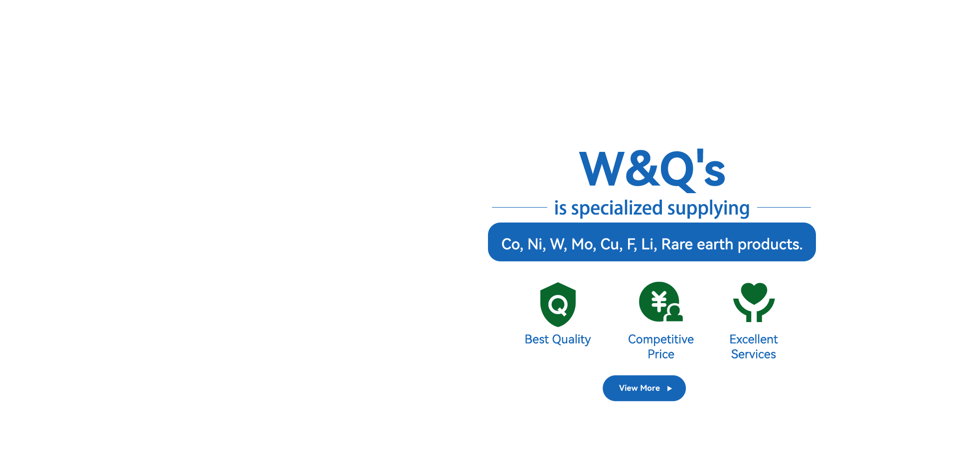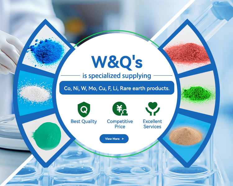 W&Q is a chemicals group of supplying Cobalt product, Nickel Product, Copper product, Fluoride Product ,Tungsten products, Molybdenum products, rare earth, Feed additives and other find chemicals.