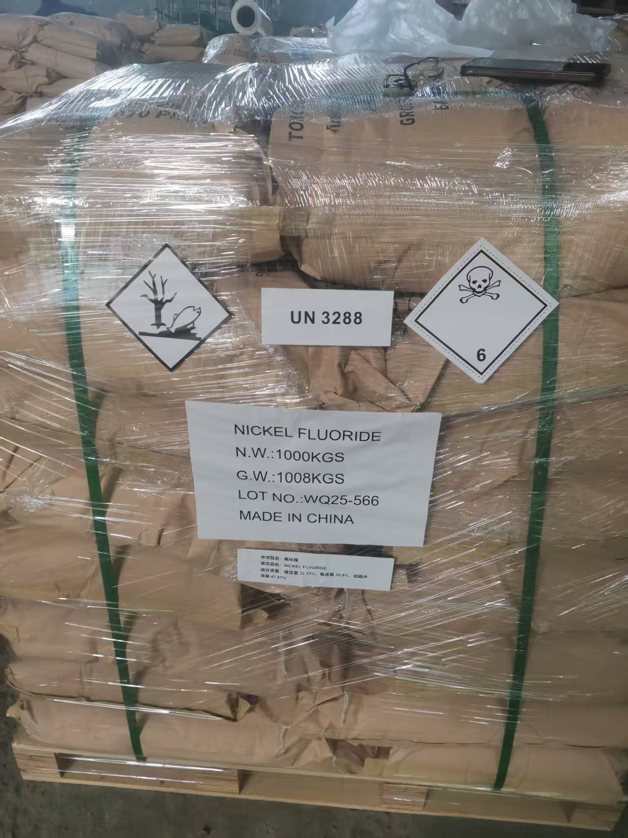 Our Nickel Fluoride Tetrahydrate comes in 25 kg net weight bags, with 40 bags (1000 kg total) per pallet. This packaging is designed to protect the product during transit and ensure easy handling at your facility.